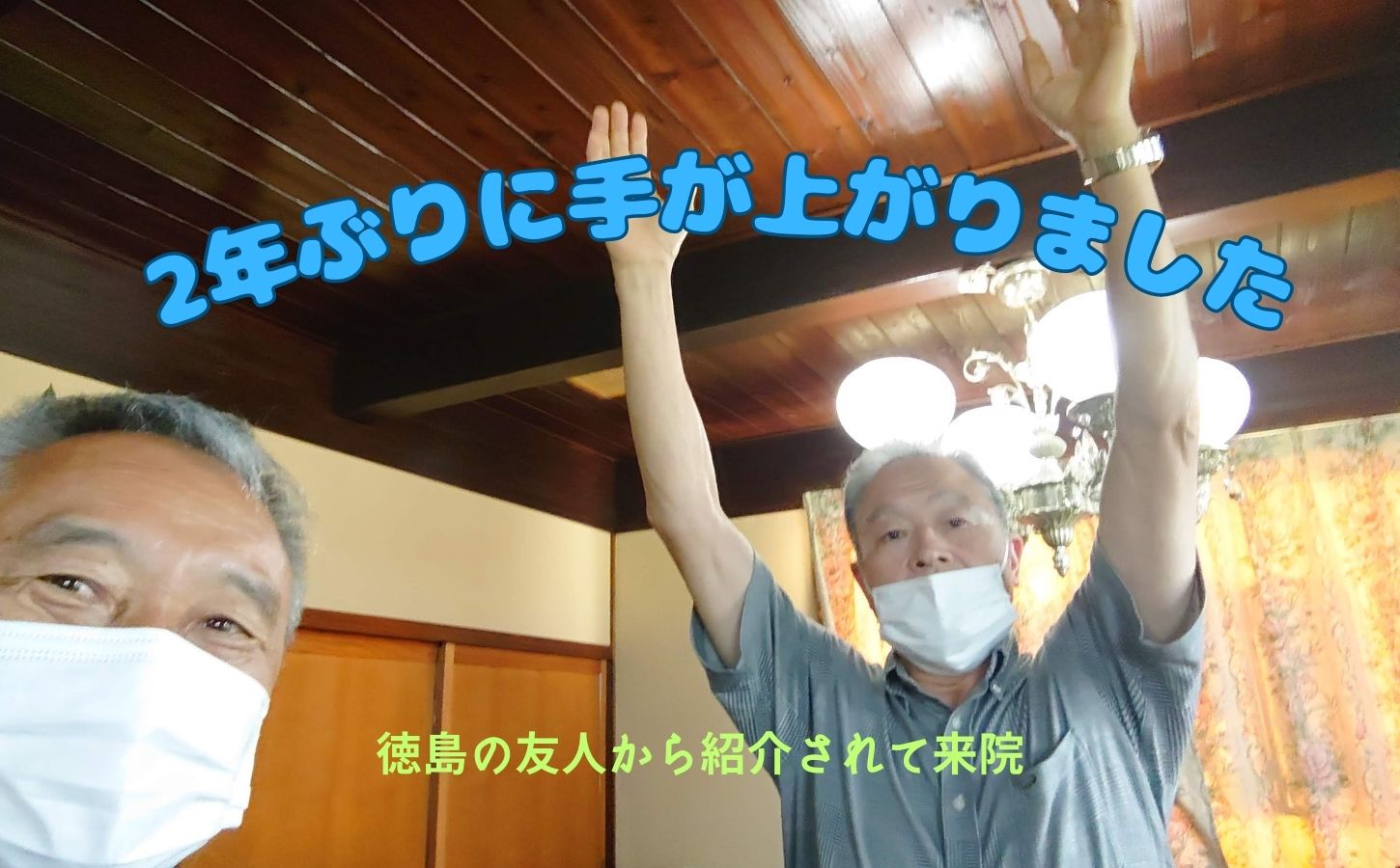 五十肩で手が上がらないで困っているところ、徳島の友人に紹介されて来院いただきました。2年ぶりに手が上がるようになりました。