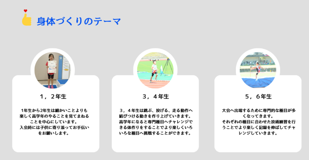 ・運動内容 陸上競技を中心に運動機能を高めるトレーニングを行う(走る、投げる、跳ぶ)